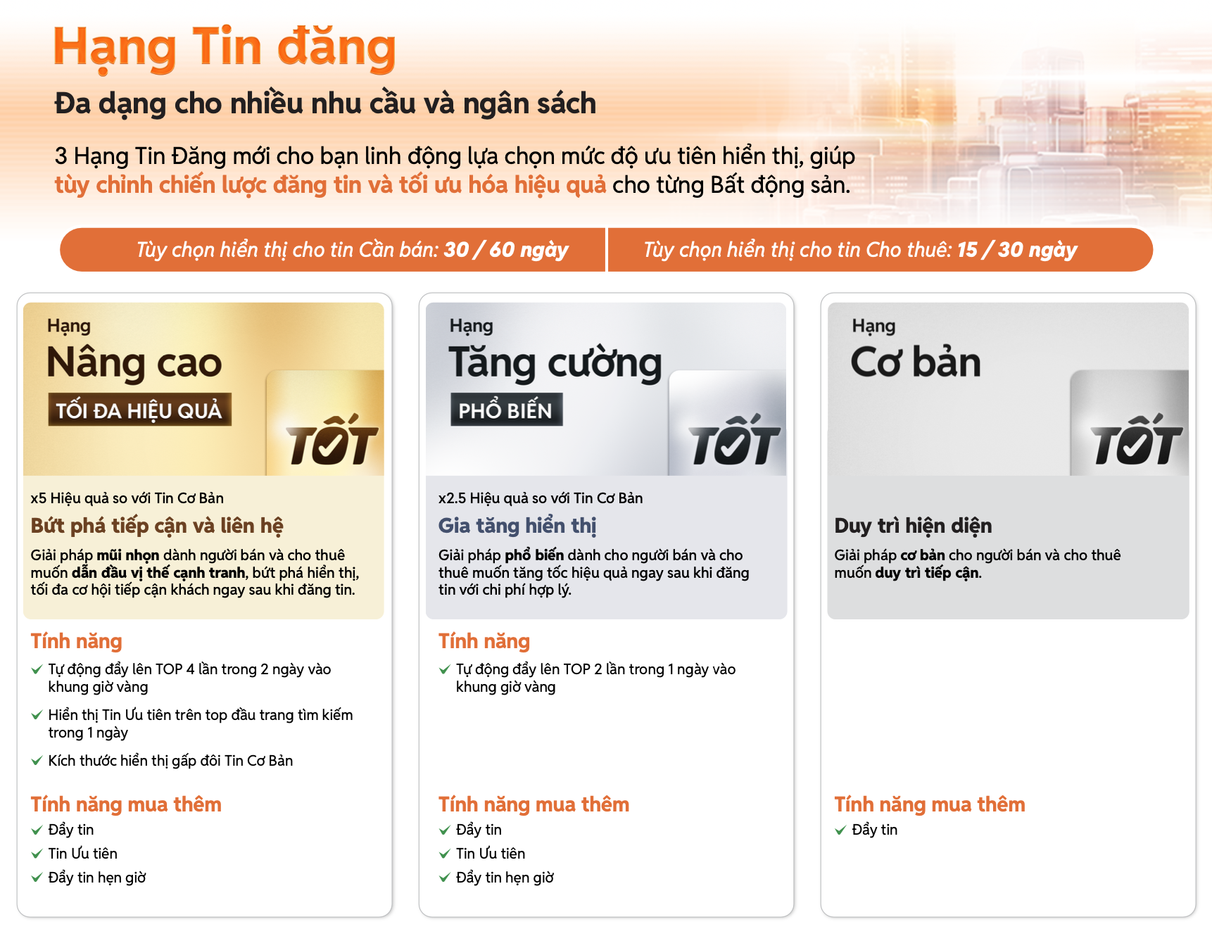 Hạng Tin Đăng là giải pháp giúp người bán và cho thuê bất động sản nâng cao hiệu quả hiển thị tin đăng, phù hợp với từng nhu cầu khác nhau – từ Cơ bản đến Nâng cao.