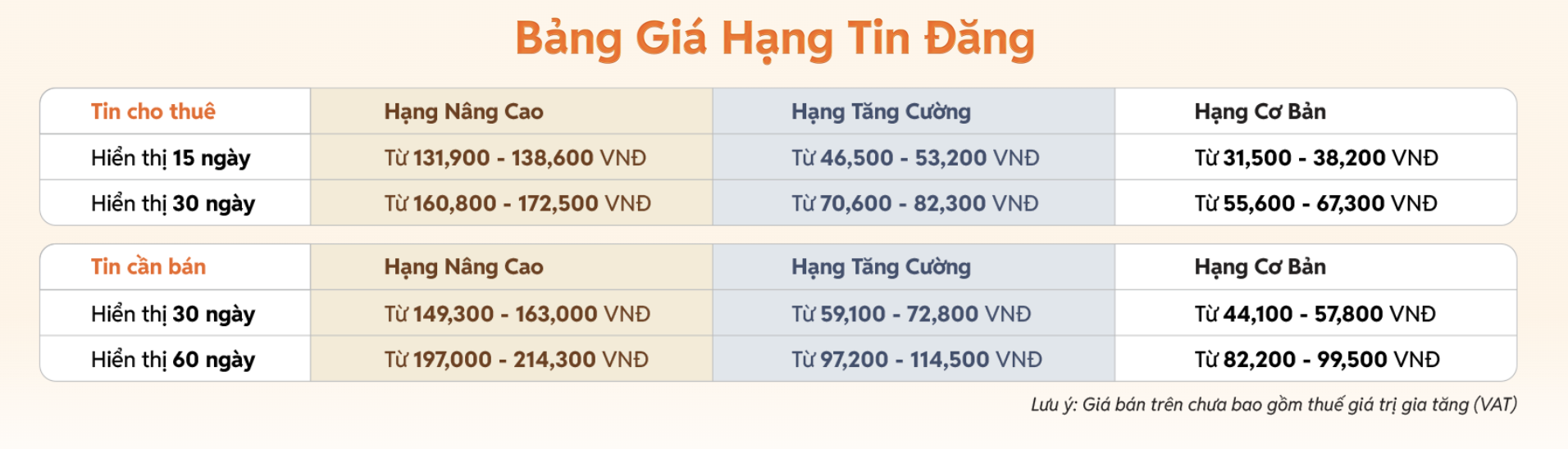 Giá Hạng Tin Đăng dao động từ 31.500 VNĐ đến 214.300 VNĐ/tin (chưa bao gồm thuế GTGT). Giá khác nhau tùy thuộc vào chuyên mục (Căn hộ/Chung cư/ Nhà ở/ Đất/ Văn phòng, Mặt bằng kinh doanh/ Phòng trọ), loại tin (Cho thuê hoặc Cần bán), thời gian hiển thị (15 hoặc 30 ngày đối với Cho thuê, 30 hoặc 60 ngày đối với Cần bán) và hạng tin (Cơ bản/ Tăng cường/ Nâng cao). Chi tiết giá cho từng hạng tin có thể tham khảo tại đây.