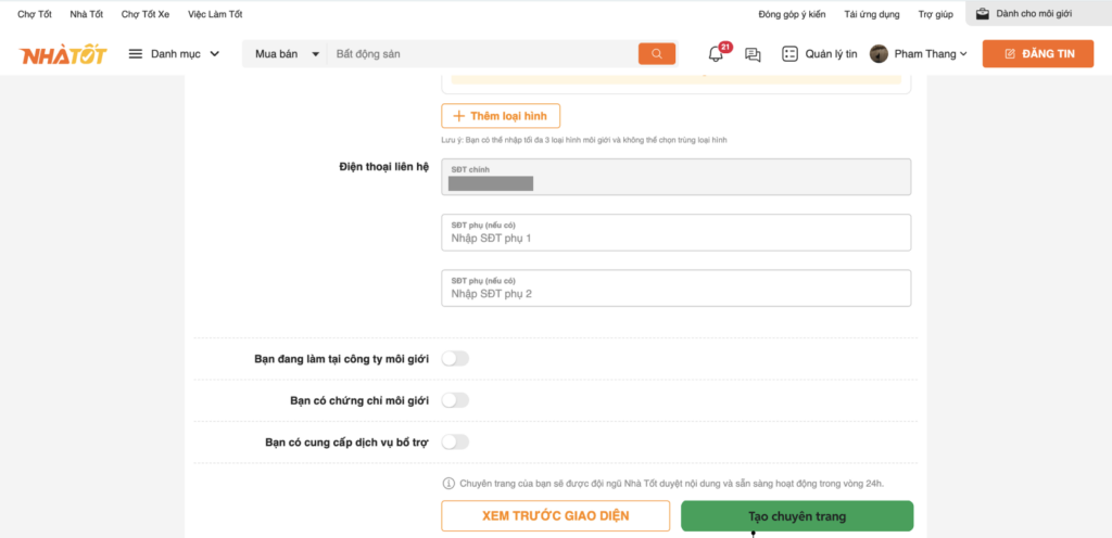 Sau khi xác nhận tạo Chuyên trang Bất động sản, Chuyên trang sẽ được hệ thống kích hoạt và chờ kiểm duyệt.