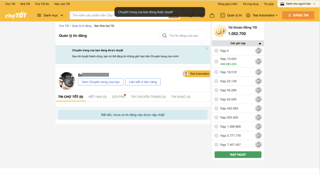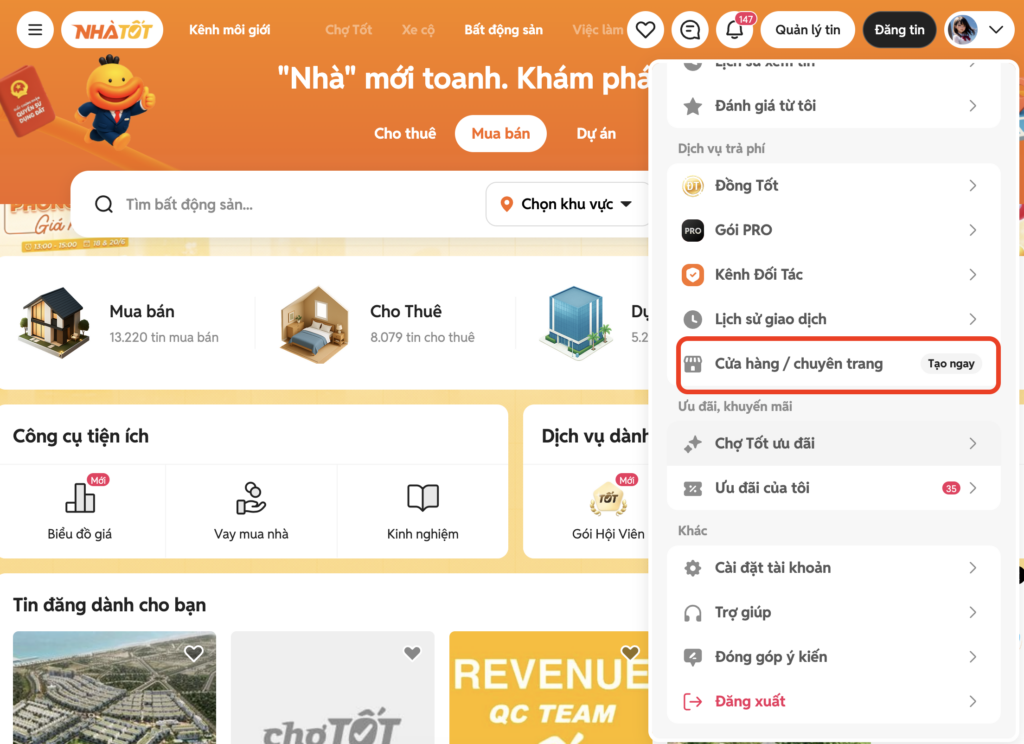 Trường hợp bạn đã sở hữu Chuyên trang Bất động sản trước ngày 30/10/2025 và chuyên trang đã hết hạn, sau khi bạn thanh toán Gói Tăng Cường hoặc Gói Nâng Cao (thuộc Gói Hội Viên Nhà Tốt), Chuyên trang Bất động sản sẽ được gia hạn theo thời hạn của Gói Hội Viên. Bạn có thể xem thêm hướng dẫn chi tiết về chỉnh sửa hoặc quản lý Chuyên trang tại đây.