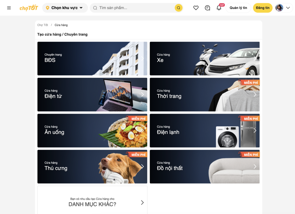 Bước 1: Đăng nhập vào Chợ Tốt, nhấn vào “Tài khoản”, chọn “Cửa Hàng/Chuyên trang”. Hoặc vào Quản lý gói Pro chọn vào mục “Chuyên trang môi giới chuyên nghiệp”.
