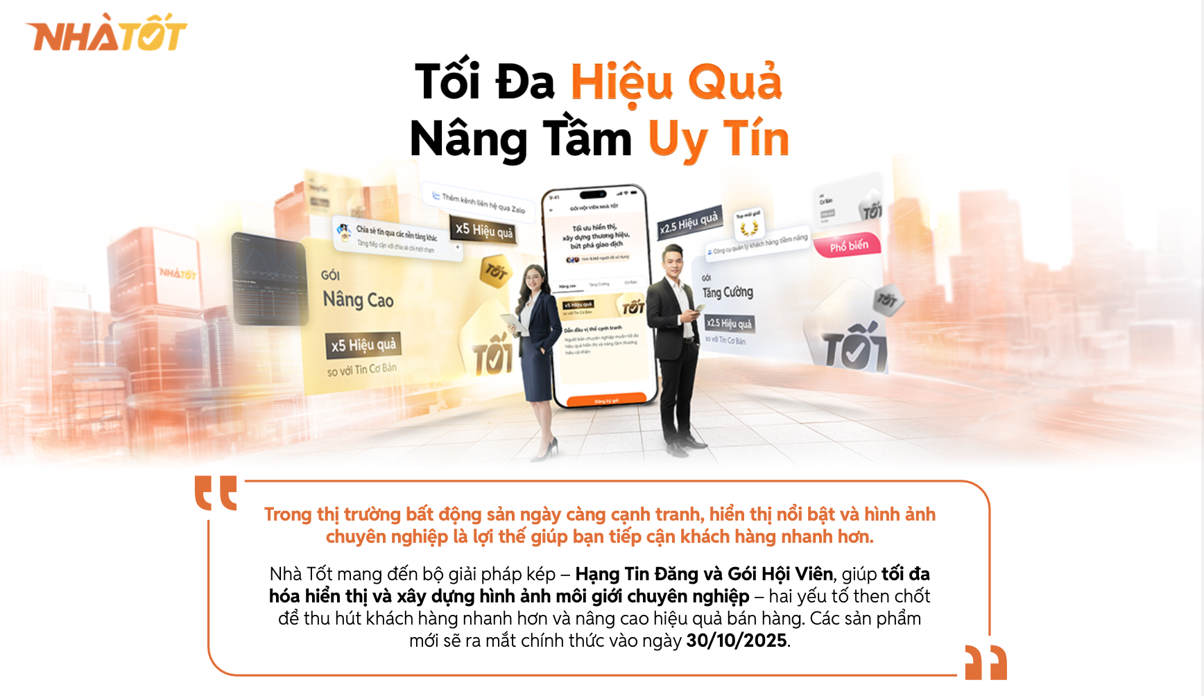 Từ ngày 30/10/2025, Nhà Tốt chính thức triển khai bộ giải pháp tăng tốc bán hàng gồm Hạng Tin Đăng và Gói Hội Viên Nhà Tốt. Đây là bước tiến quan trọng giúp người bán tăng độ hiển thị tin đăng, xây dựng thương hiệu uy tín chuyên nghiệp và tiếp cận người mua nhanh hơn.